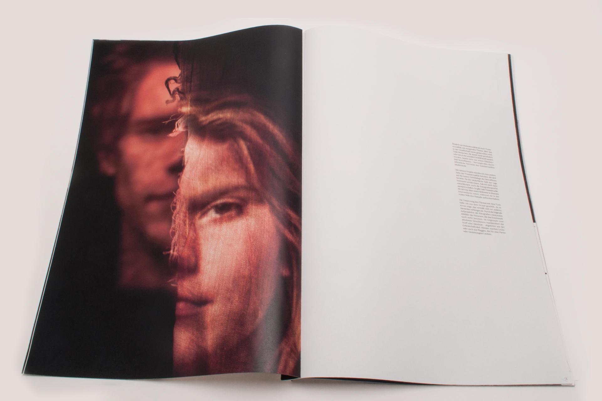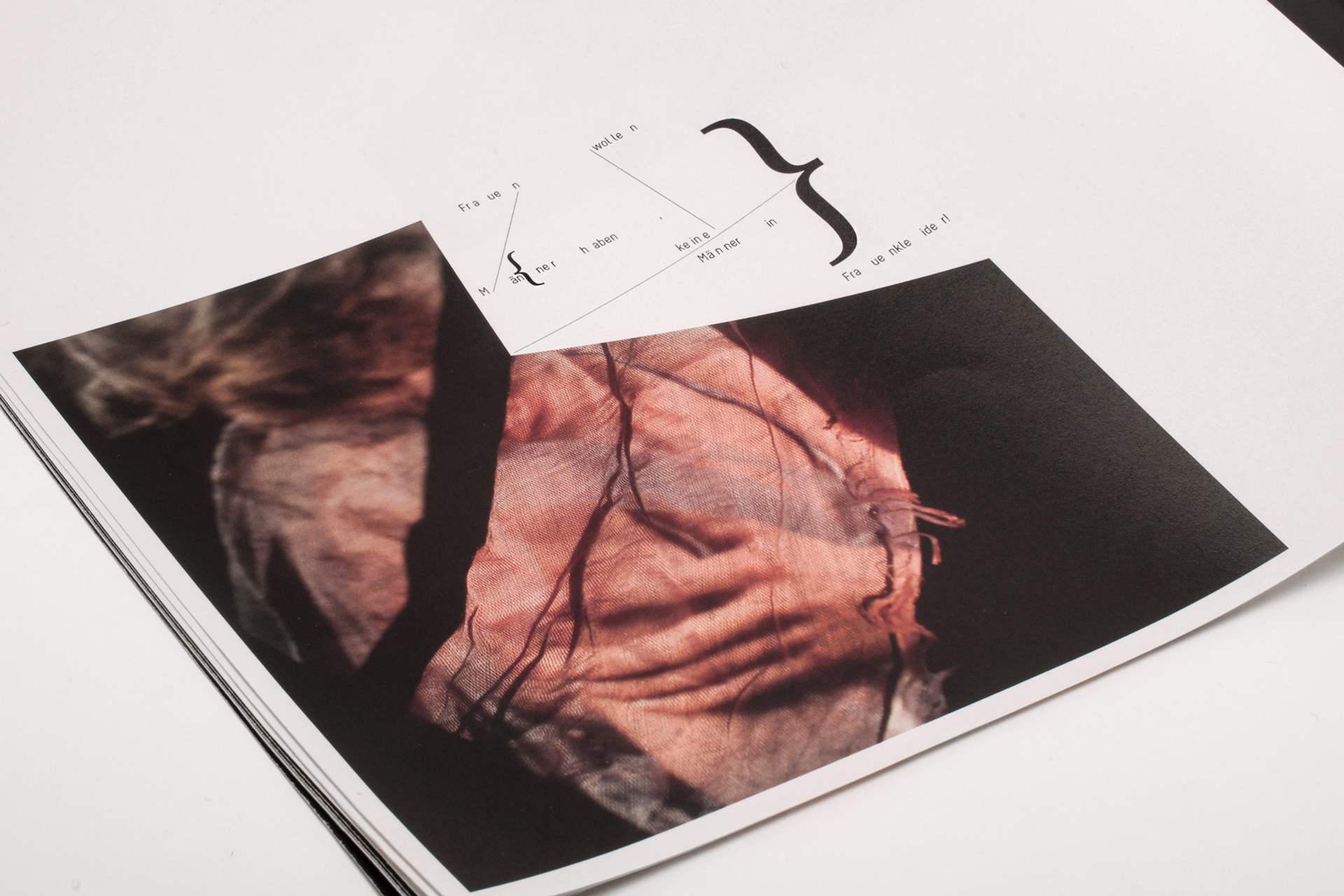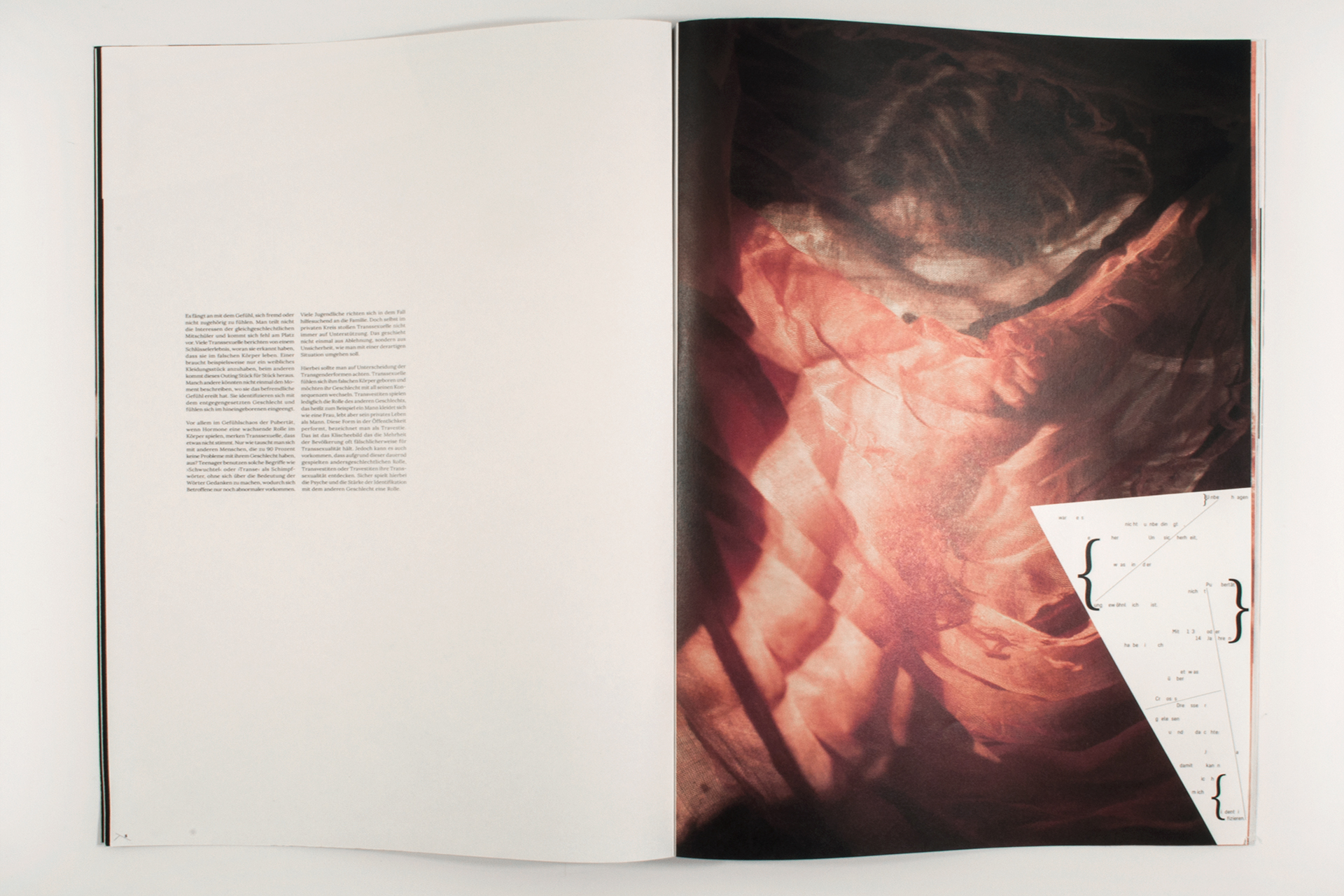 Zitate aus diversen Internetforen für Transsexuelle transportieren deren Gefühlswelt. Dafür wurde aus jeder Fotografie etwas »herausgebrochen«. Die Typografie ist abgestottert und wird von geschweiften Klammern als auch zerstreuten Linien umrahmt.