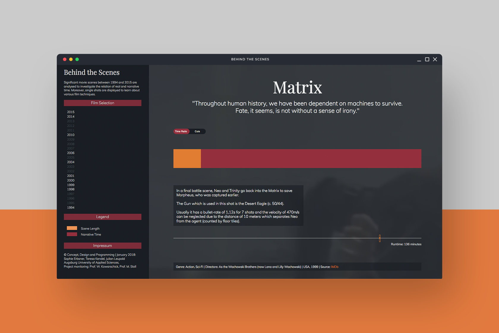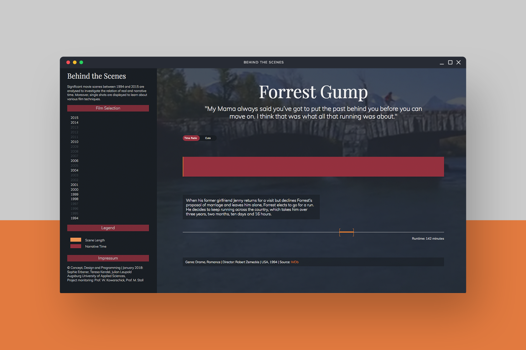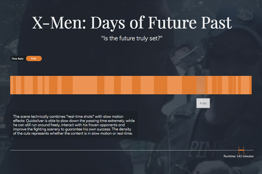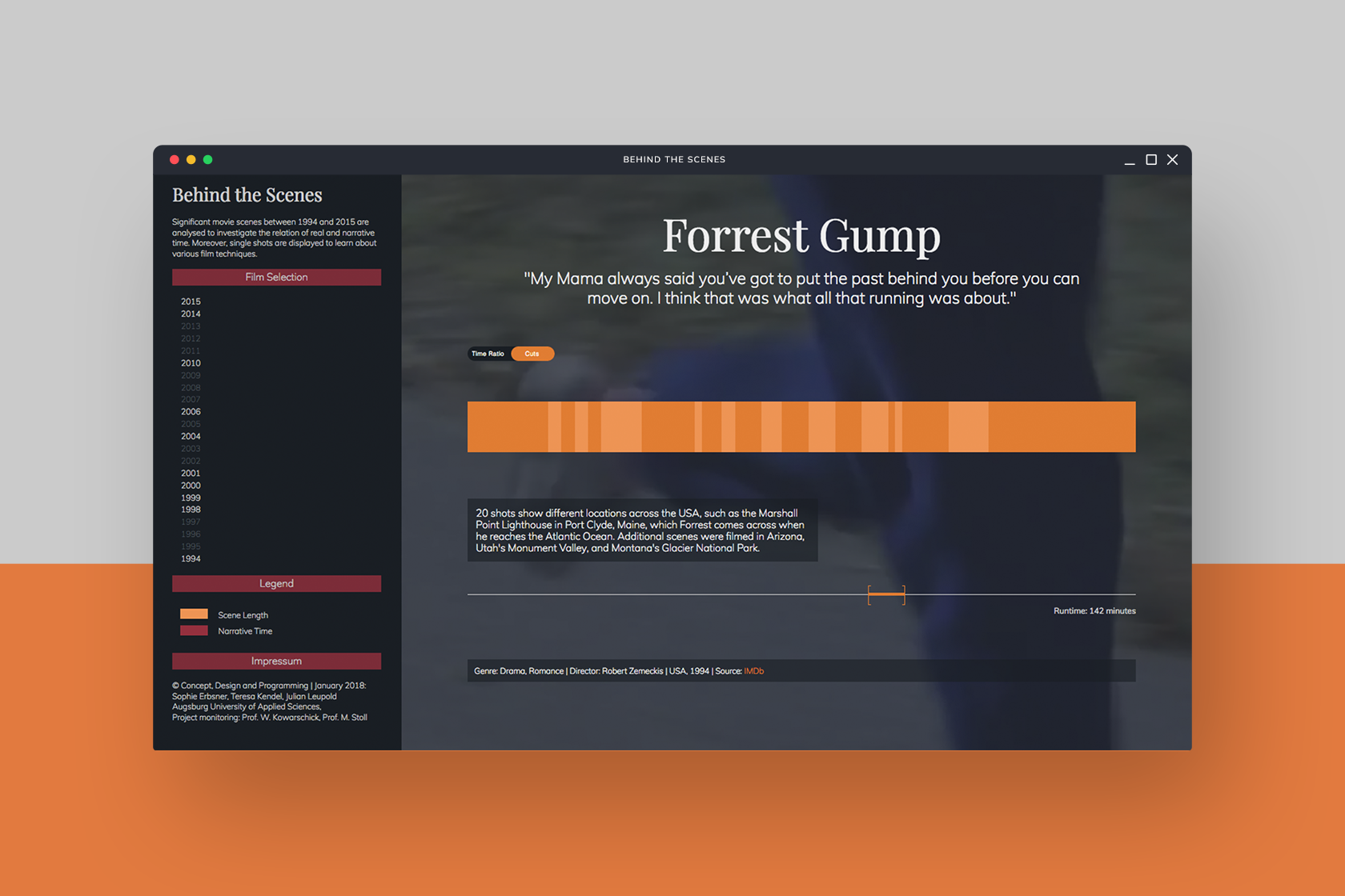 Jeder Timecode und Schnitt einer Szene wurde manuell abgelesen und in die Anwendung übertragen. Über einen Hover wird einem angezeigt, wie lange ein Abschnitt dauert. Auf diese Weise werden in der Webanwendung ca. zehn Szenen aus bekannten Filmen (1994 bis 2015) analysiert.