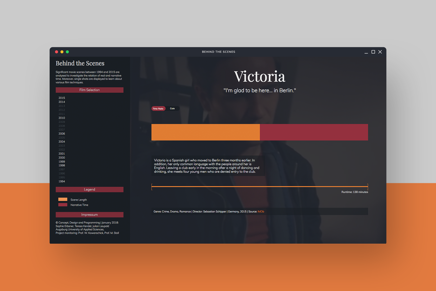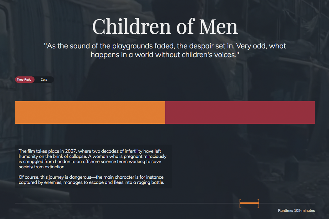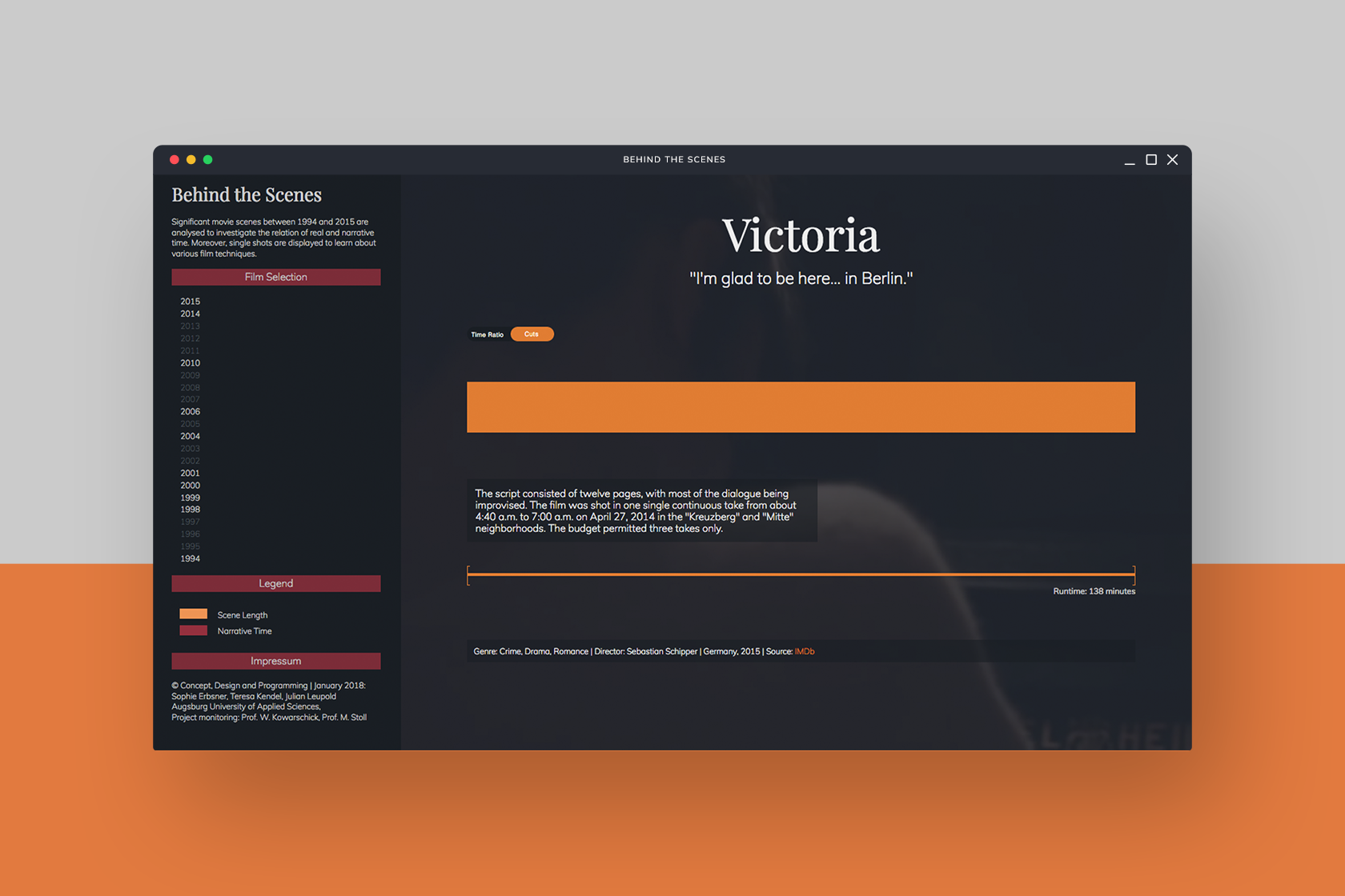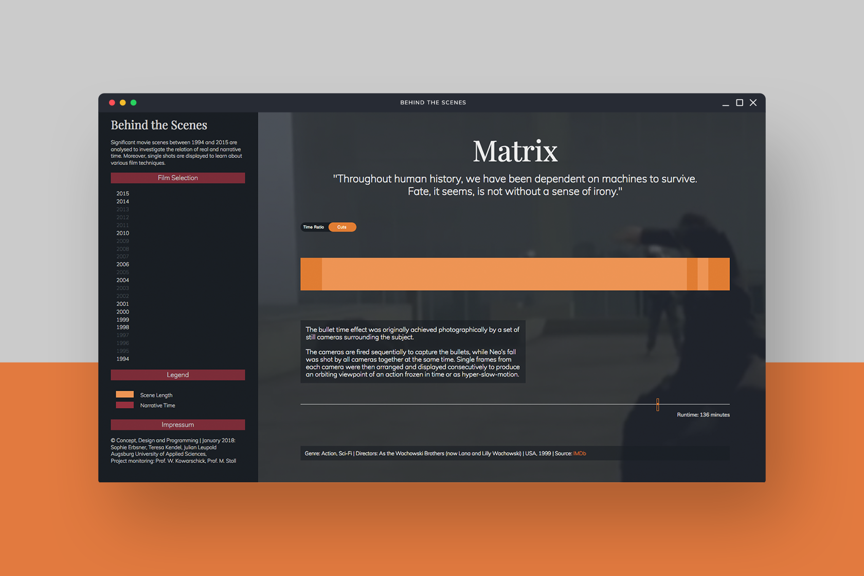 Jeder Timecode und Schnitt einer Szene wurde manuell abgelesen und in die Anwendung übertragen. Über einen Hover wird einem angezeigt, wie lange ein Abschnitt dauert. Auf diese Weise werden in der Webanwendung ca. zehn Szenen aus bekannten Filmen (1994 bis 2015) analysiert.