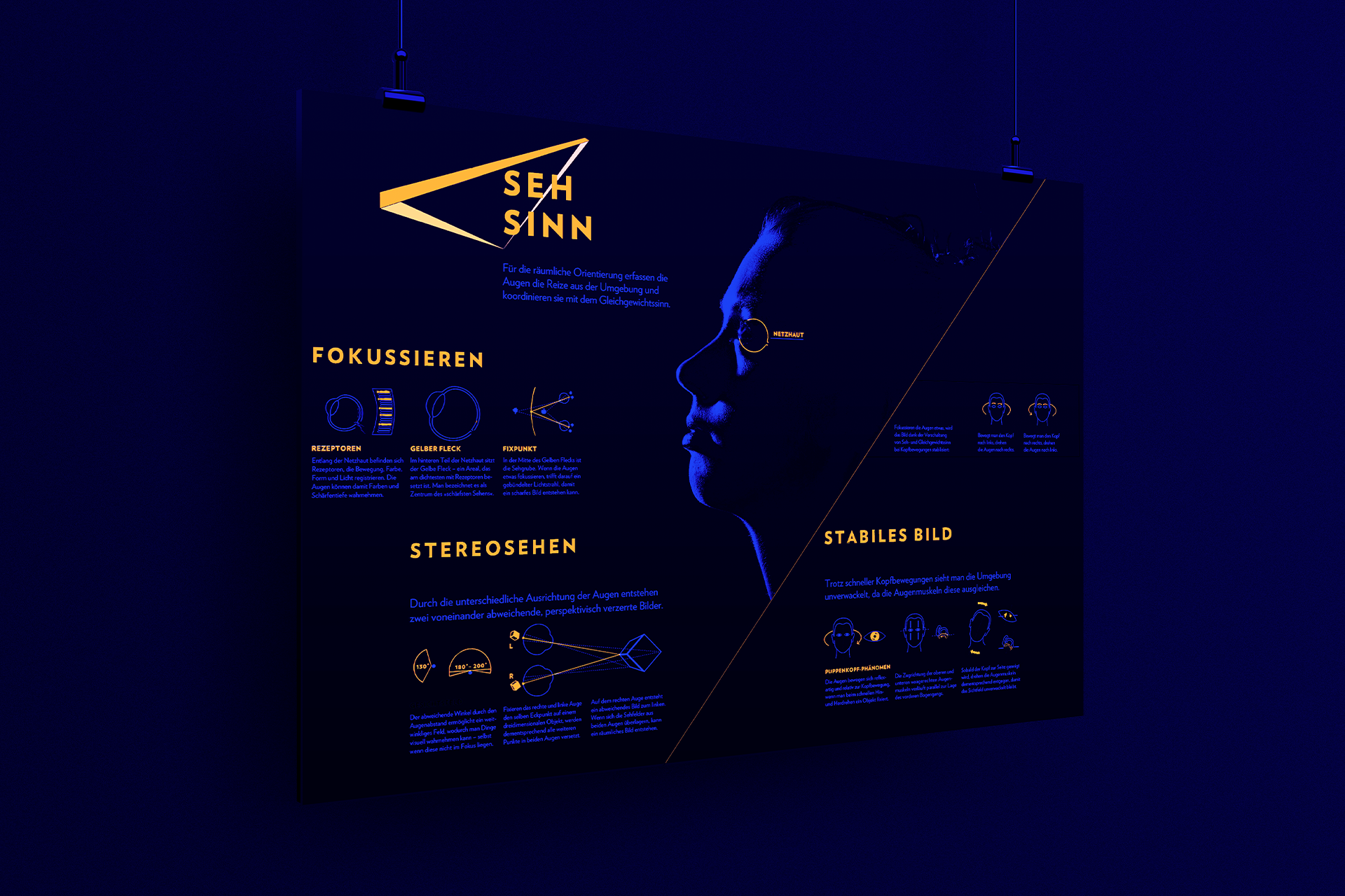 So wird durch »Projection Mapping« auf einem schiefen Podest das Gleichgewichtsempfinden manipuliert, durch eine Spiegelbrille die räumliche Orientierung beeinträchtigt und durch »Motion Tracking« die Auswirkung einer Drehung visualisiert.