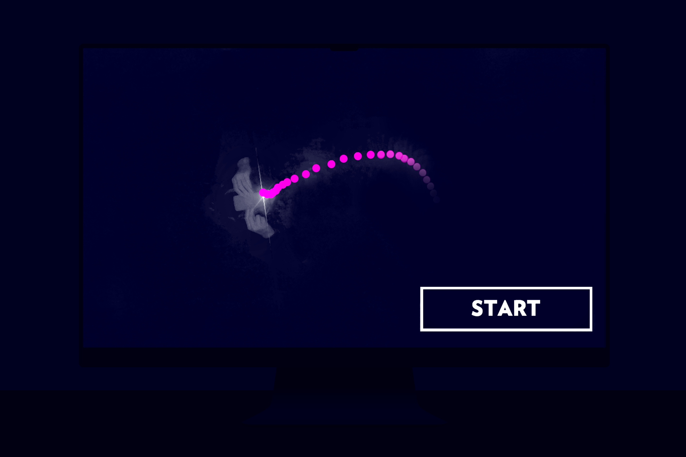 Eine Kamera filmt die Personen aus der Vogelperspektive. Um ihre Bewegungen verfolgen zu können, setzen diese sich eine LED auf den Kopf. Die Koordinaten des »brightest points« im Blickfeld der Kamera werden registriert und auf einem Monitor grafisch als Linie wiedergegeben.