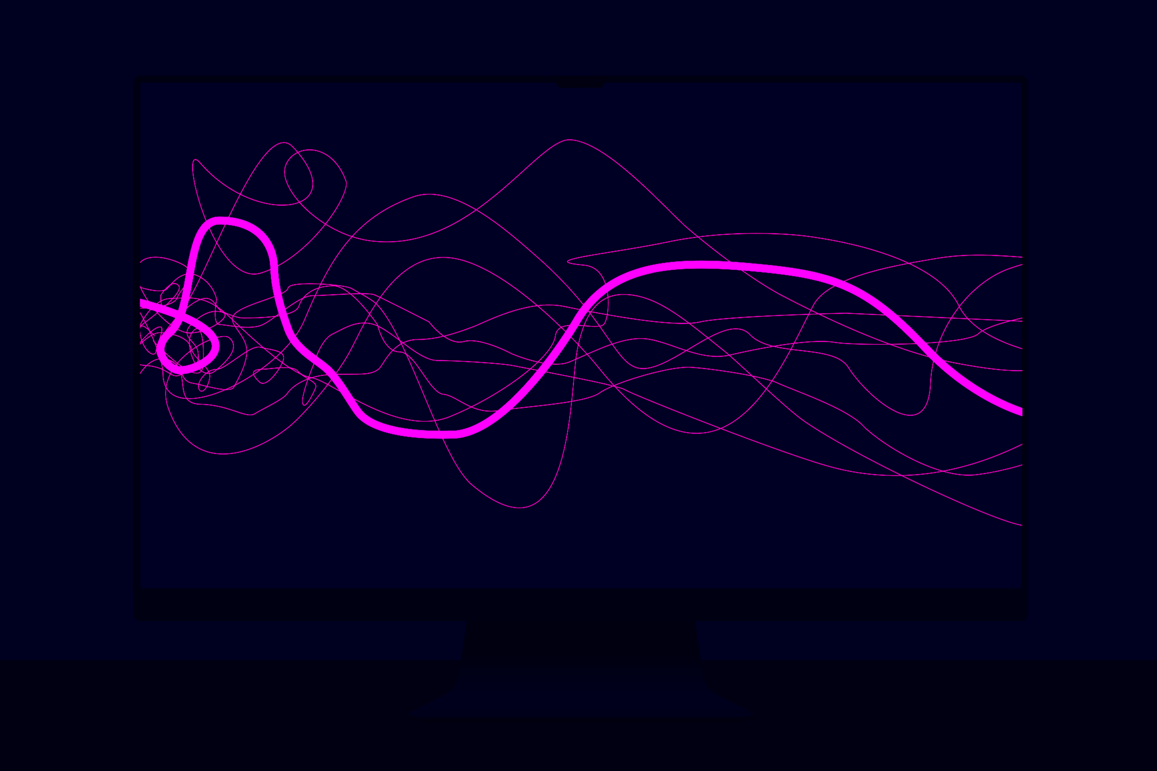 Die aktuellste (dick) lässt sich anschließend am Monitor mit den vorherigen Linien (fein) vergleichen. Aus dieser Grafik entsteht nach einigen Durchläufen ein zusammenhängendes grafisches Kunstwerk.